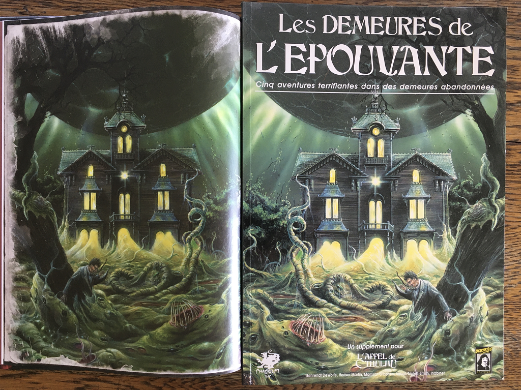Here’s some trivia for you; I didn’t realise until I was getting the books out to reminisce about good times in dangerous buildings that the French edition from the 1990s flipped the artwork, cropped it closer and lightened it up. All that extra detail just adds to the doom. (The gatefold for reference is from the inside of the new edition, because Chaosium books are full colour on the inside now too.)