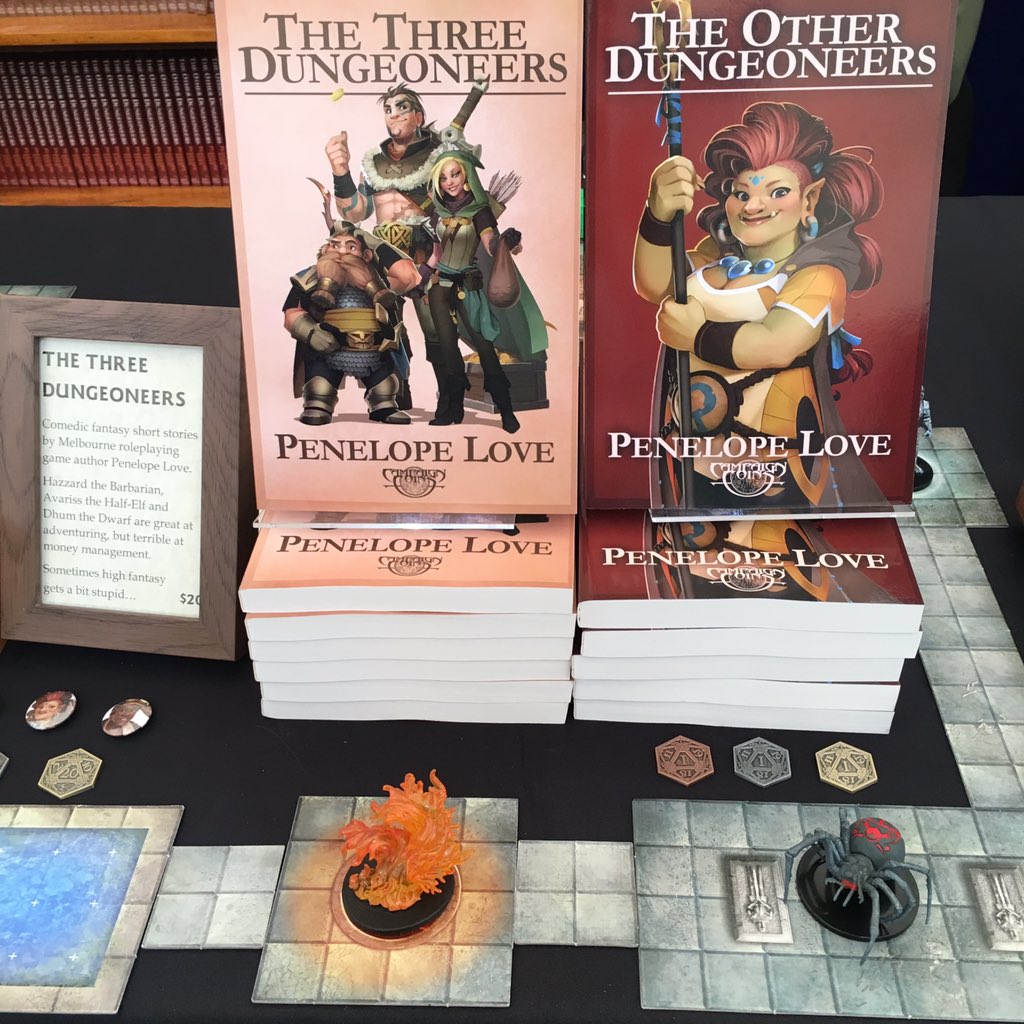 We took our two collections The Three Dungeoneers and The Other Dungeoneers to the last actual convention we attended, Supa Nova Comic Con & Gaming in Melbourne in early March 2020. The crowd was already thining as the implications of COVID-19 were sinking in, and everything and everyone was awash with hand sanitizer, but we still had fun. We all miss the community of playing games and we hope we can all get together in conventions again soon.